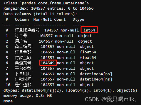 通过info方法发现有几个小问题,订单顺序编号应该是object,渠道编号有缺失值,这些问题稍后处理。