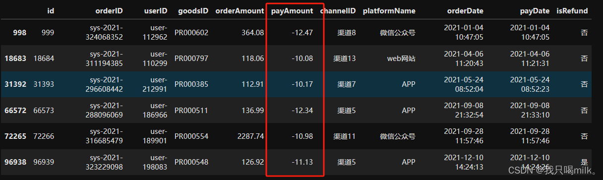 # 筛选订单金额小于0的数据,用来提取id