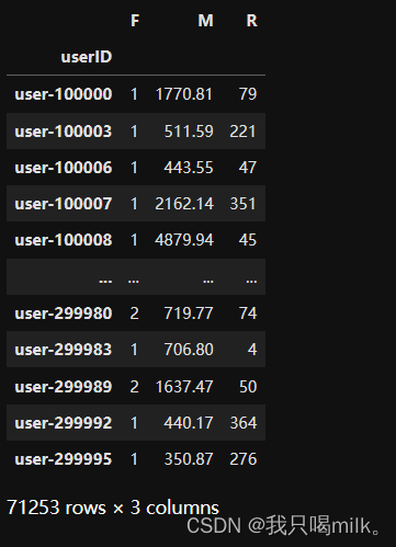 orderID是用来计算订单次数,payAmount用来计算金额总和,payDate1先提取最大日期即最近最后一次购买日期,再计算和在一个时间窗口最后一天的相差天数。