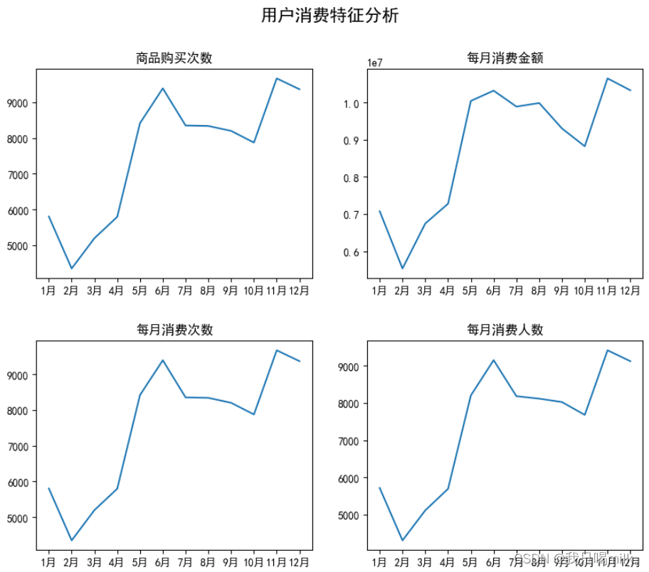 整体分析,可以按时间、地区、门店等维度统计,在这里是按月份统计商品购买次数、消费金额、消费次数、消费人数。