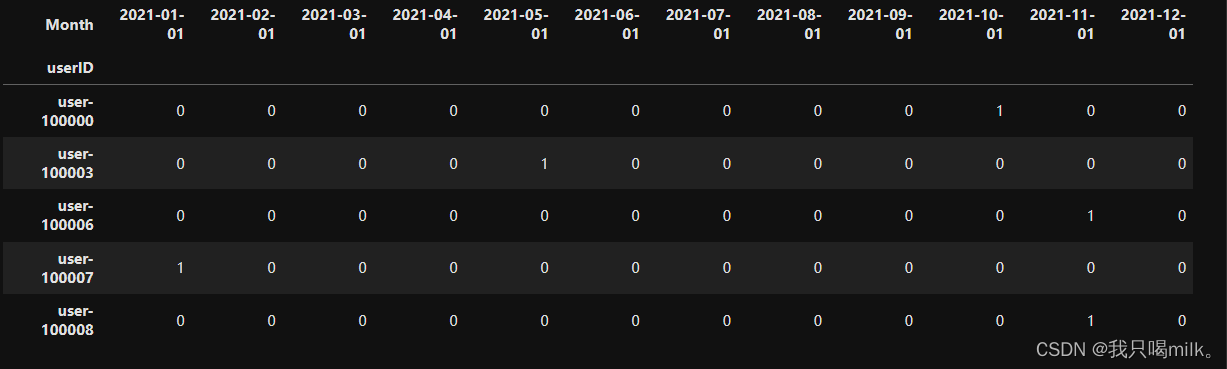 purchase_df = pivoted_counts.applymap(lambda x : 1 if x>0 else 0)