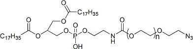 1,2-二硬脂酰-sn-甘油-3-磷酸乙醇胺(DSPE)共轭聚乙二醇,DSPE-PEG是一种兼具亲水性和疏水性的磷脂-PEG共轭物。聚乙二醇化磷脂是一种优良的脂质体形成材料,可用于药物递送、基因转染和疫苗递送。DSPE-PEG-N3产品可用于使用点击化学制备聚乙二醇化脂质体。叠氮化物在有或没有铜催化剂的水溶液中很容易与炔烃或环氰基反应。磷脂的聚乙二醇化提高了胶囊药物的血液循环时间和稳定性。
