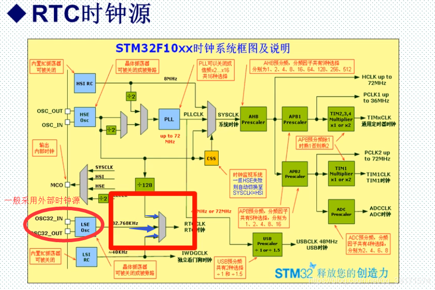 RTC所采用的时钟源:一般使用比较准确的外部时钟源