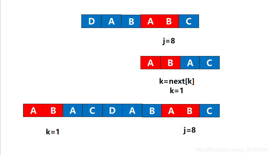 很遗憾这个位置,无法使其成为长度为4的相同前后缀,那么根据代码只能执行k=next[k]了。这样画比较难受,我把前缀直接拿到下面来