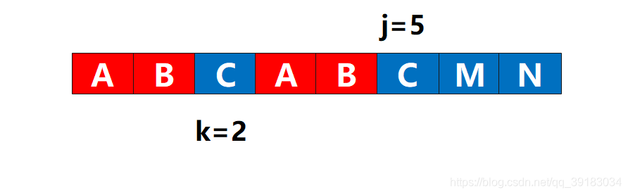 比如下面,可以看出,此时k来到了C的位置,j也来到了C的位置,他们之前都各自在B的位置,由于相同,所以来到了现在位置,现在他们要判断此刻对应的位置是否可以也将其算入相同的前后缀