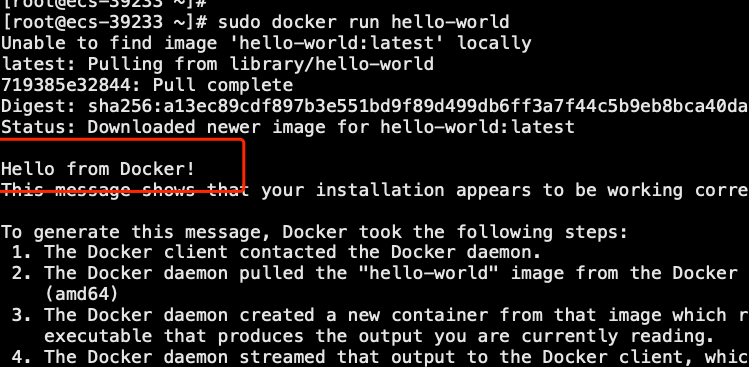 这个命令会下载一个测试镜像,并在容器中运行它。当容器运行时,它会打印一条确认消息并退出。