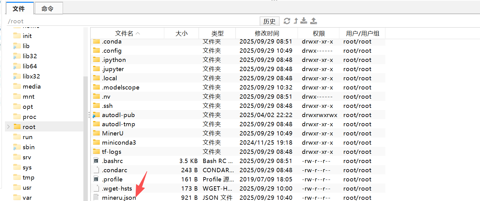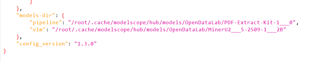 模型下载完成后在默认位置, 同时会生成一个"mineru.json" 文件在根目录。