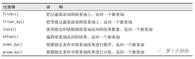 从上面的视图函数中我们看到,使用了 filter_by,那么我们再看下其他的过滤器