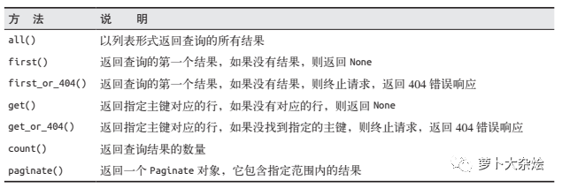 在查询上应用指定的过滤器后,通过调用 all() 执行查询,以列表的形式返回结果。除了all() 之外,还有其他方法能触发查询执行。