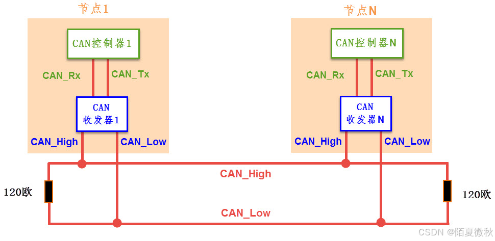 CAN 通讯节点由一个 CAN 控制器及 CAN 收发器组成,控制器与收发器之间通过 CAN_Tx 及CAN_Rx 信号线相连,收发器与 CAN 总线之间使用 CAN_High 及 CAN_Low 信号线相连。其中CAN_Tx 及 CAN_Rx 使用普通的类似 TTL 逻辑信号,而 CAN_High 及 CAN_Low 是一对差分信号线,使用比较特别的差分信号,下一小节再详细说明。