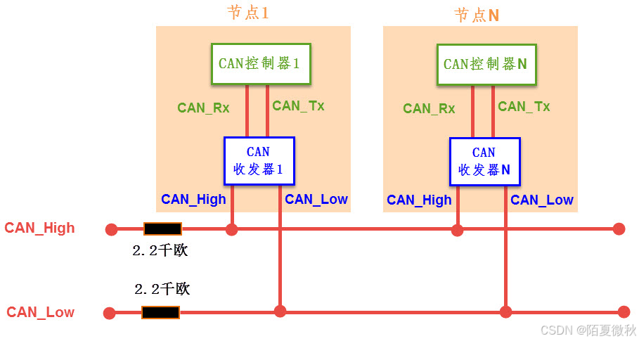 与 I2C、 SPI 等具有时钟信号的同步通讯方式不同, CAN 通讯并不是以时钟信号来进行同步的,它是一种异步通讯,只具有 CAN_High 和 CAN_Low 两条信号线,共同构成一组差分信号线,以差分信号的形式进行通讯。比较像RS485。