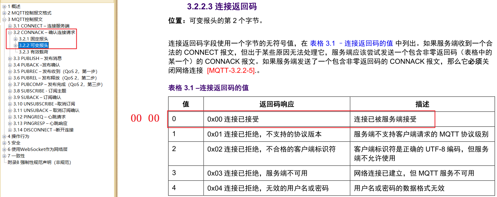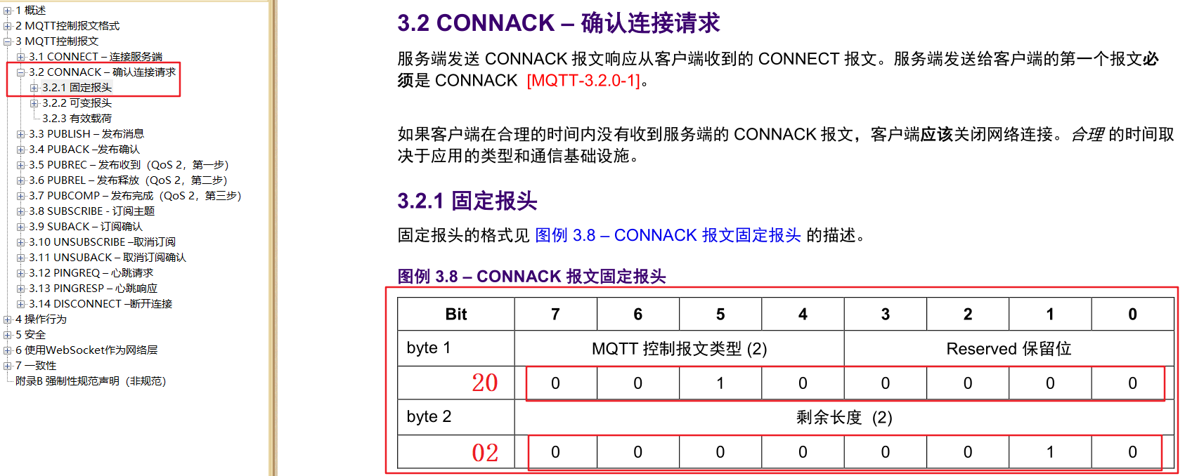 这里为啥是收到的是20 02 00 00 ,我们可以去看看数据手册中3.2小节的connect确认连接请求。