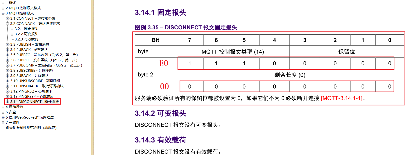 我们可以看到数据手册的3.14小节,断开连接的报文是 E0 00