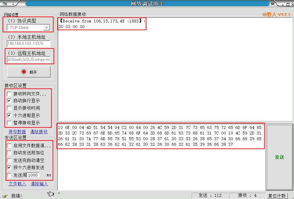 4.在发送数据之前要先勾选按16进制发送,之后会在网络调试助手的接受端出现:20 02 00 00 说明发送正常接收正常,如果点击发送按钮之后网络调试助手马上就断开或者接收不到出具的话,就说明你发送的数据有问题,请仔细回去好好把报文数据整理一遍,否则不能发送成功。