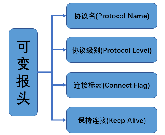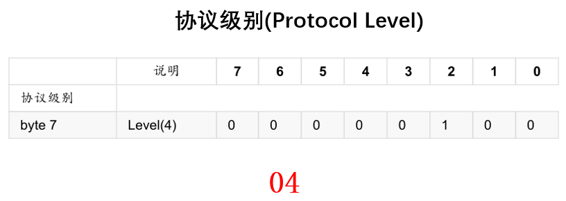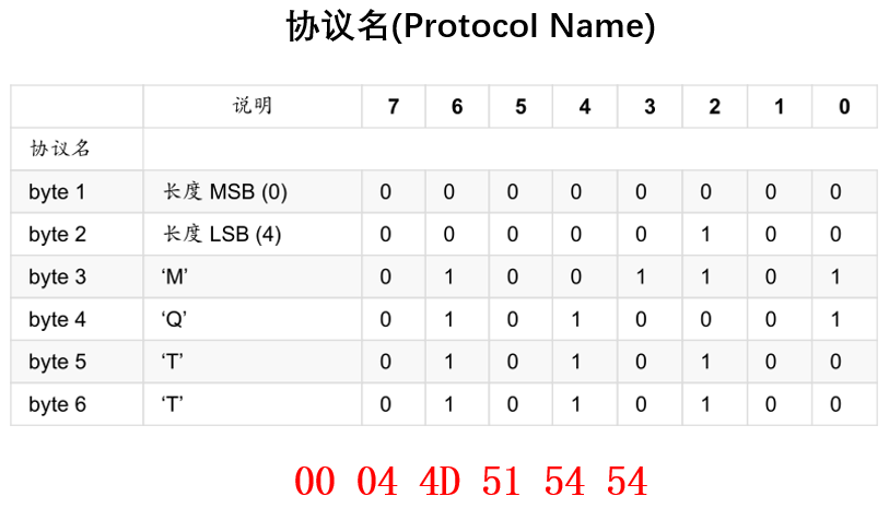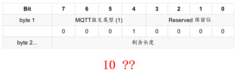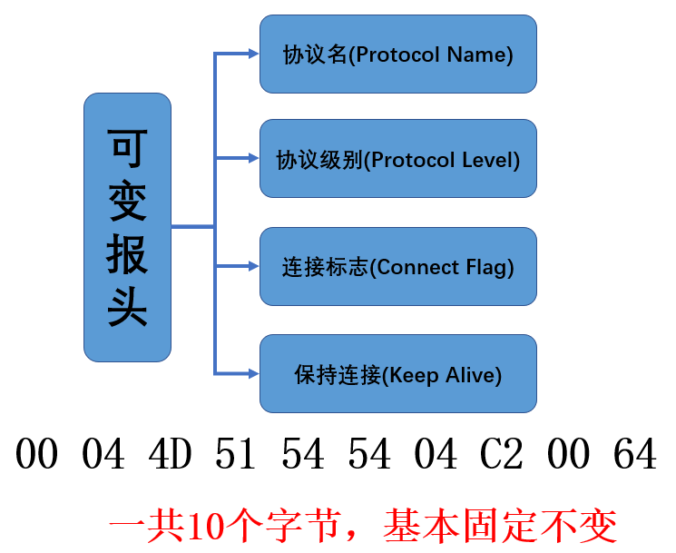 固定报头包含两个字节,第一个字节是固定的:0x10,第二个字节是是剩余长度字段,剩余长度等于可变报头的长度(10字节)加上有效载荷的长度。