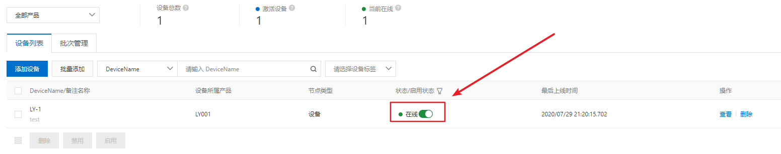 这样我们的客户端就与阿里云的服务端连接起来了,我们现在可以去看看阿里云官网就会发现此时的LY-1设备处于在线状态。哈哈,是不是很奇妙啊!