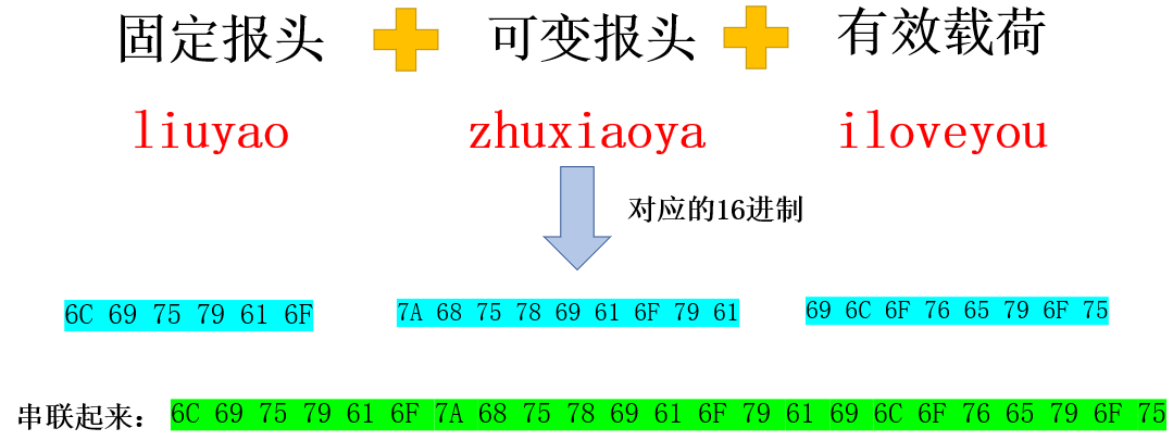 2.假设我们得到了固定报头是“liuyao”、可变报头是“zhuxiaoya”、有效载荷是“iloveyou”。我们要把这些字母转换成对应的16进制。然后再把它们串联起起来就得到。