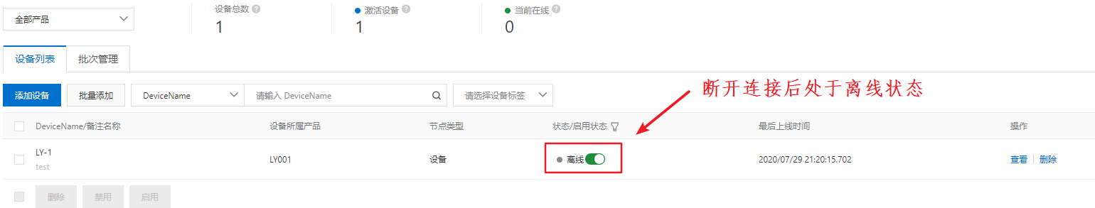 这是我们再到阿里云官网(刷新一下网页)就会发现此时的LY-1设备处于离线状态。哈哈,是不是很奇妙啊!