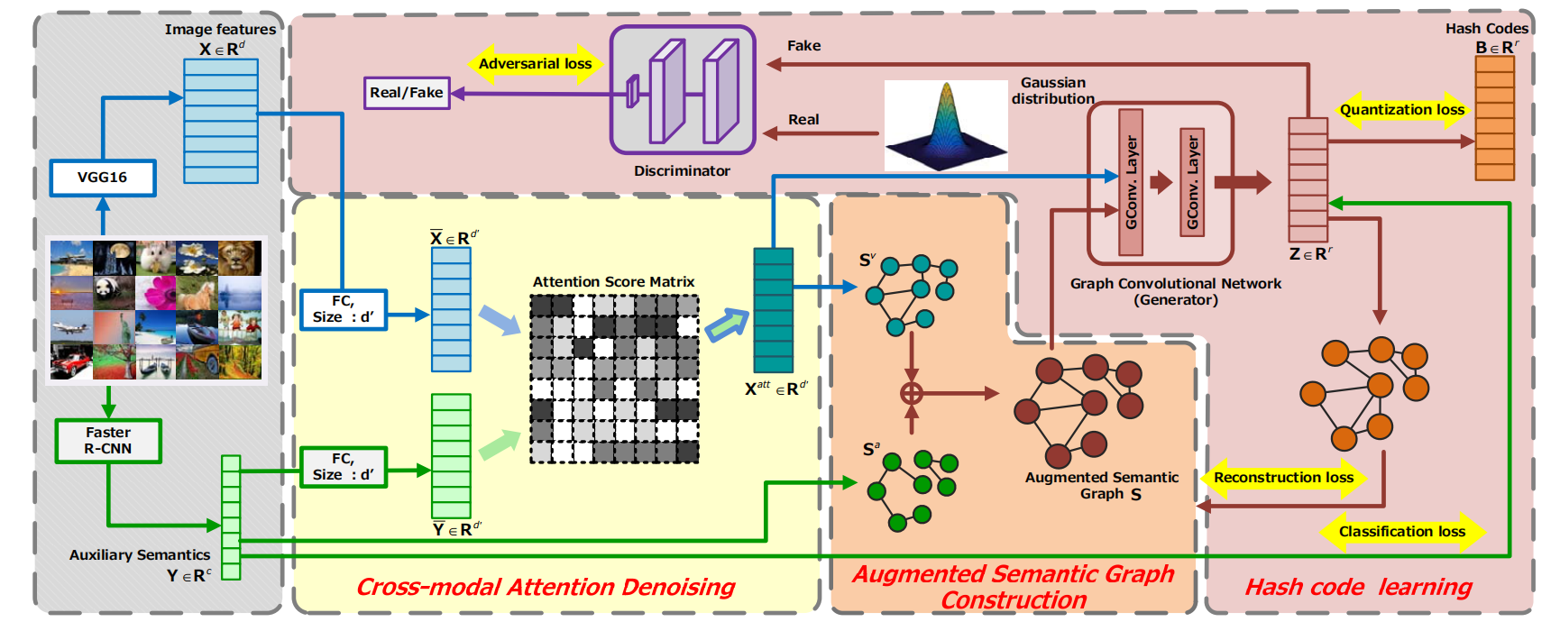 其次本文基于提取的辅助语义信息,设计了一个跨模态注意模块,以自适应地减轻深度图像特征的不利影响。此外,还提出了一种基于去噪特征和增强语义图的对抗性正则化图卷积网络,通过重构捕获的语义关系来学习语义增强的哈希码。