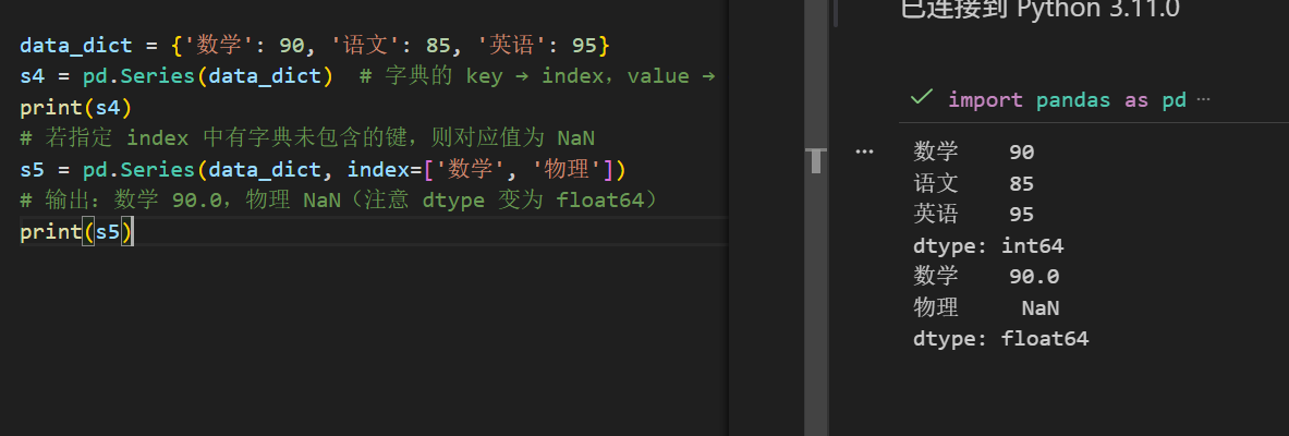 # 输出:数学 90.0,物理 NaN(注意 dtype 变为 float64)
