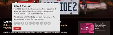 Joyride是一个jQuery插件,可以利用它来创建一个引导用户如何操作网站功能的向导。通过定义一个操作步骤顺序,这个插件会在需要操作的HTML元素旁边显示一个帮助说明的Tooltips。