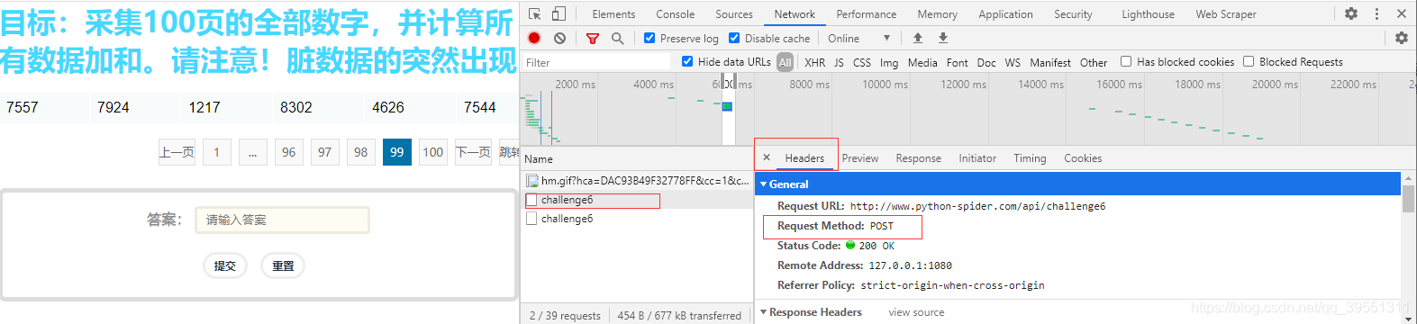 打开开发者工具找到数据请求,challenge6 就是我们要找的数据请求,查看Header信息是个POST请求,在查看Prevew是返回的数据信息
