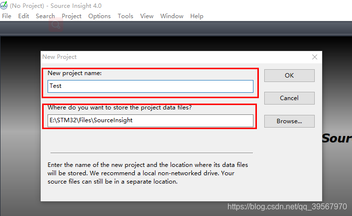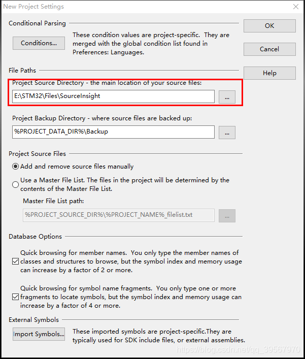 点击 OK 出现如下所示 New Project Setting (新工程设置),标志的框中选择要阅读的源码路径