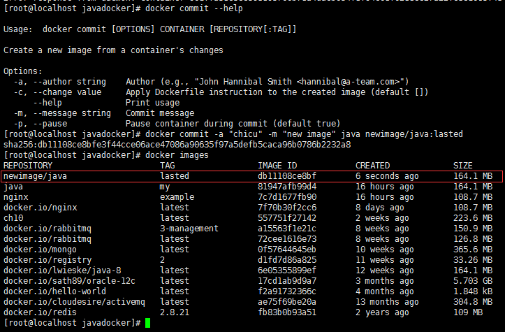 docker commit -a "chicu" -m "new image" java newimage/java:lasted-a:作者