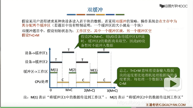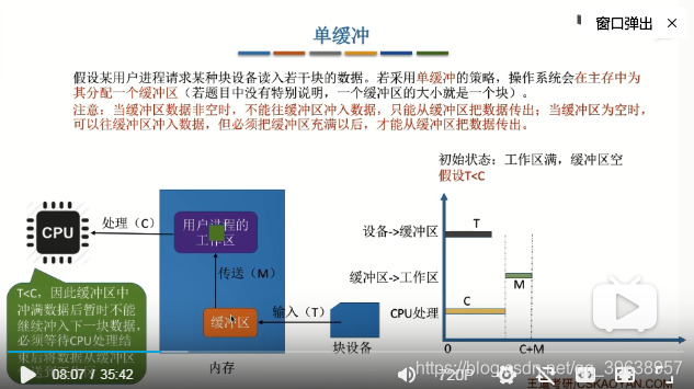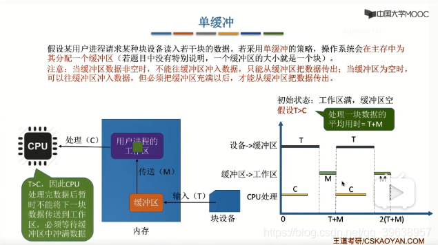 因此,单缓冲情况下,平均处理一个块的用时为 max(T,C)+M