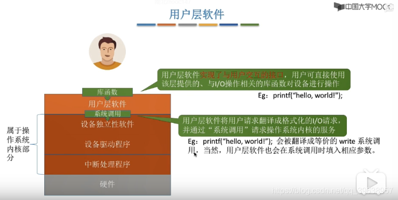 自顶向下依次是 用户层软件,设备独立性软件,设备驱动软件,中断处理程序。和计算机网络模型神似