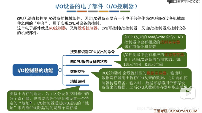 IO设备由 机械部件和电子部件 两部分组成,电子部件就是电路板,也就是IO控制器。IO控制器作为CPU控制IO设备机械部件的中介。它含有控制寄存器(存放CPU命令的参数),状态寄存器(设备是否能进行读写操作),数据寄存器(数据中转站)。由于IO控制器中含有多个寄存器,当CPU发出命令后,IO控制器要进行地址转换(由IO控制器的IO逻辑部分完成),找到对应的寄存器。