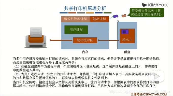 当CPU发出打印请求后,在假脱机管理进程的控制下,即使打印机忙碌,也可以先将要打印的数据(用户进程的数据)放入磁盘的输出井中(经过内存缓冲区),同时还会生成打印请求表(含有打印数据的位置),将打印请求表挂在假脱机队列末尾,之后再由输出进程处理打印请求表。输出进程将磁盘输出井的数据经内存缓冲区传给打印机设备。