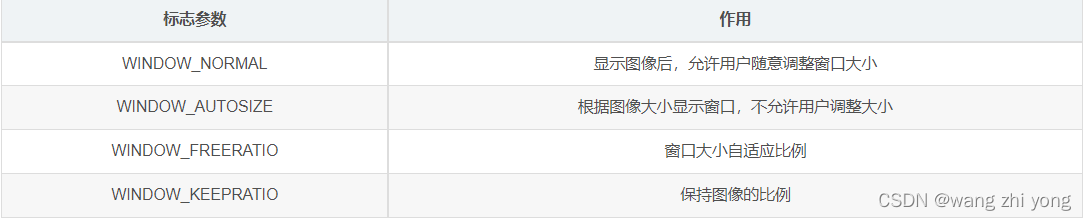 namedWindow("输入窗口", WINDOW_NORMAL); 其中"输入窗口"为显示窗口的名字;第二个参数是对窗口的大小、比例进行设置。具体意义如下表: