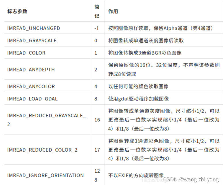 第二个参数是对显示的图片进行设置 比如灰度、彩色等,也可以不设置第二个参数,直接读取图片,这样显示的就是原图; 第二个参数意义如下表: