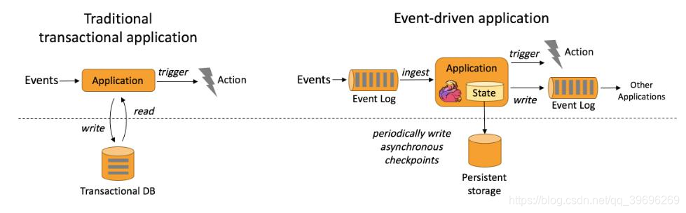 事件驱动型应用是一类具有状态的应用,它从一个或多个事件流提取数据,并根据到来的事件触发计算、状态更新或其他外部动作。比较典型的就是以 kafka 为代表的消息队列几乎都是事件驱动型应用。与之不同的就是 SparkStreaming 微批次,如图: