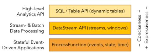 最底层级的抽象仅仅提供了有状态流,它将通过过程函数(Process Function)被嵌入到 DataStream API 中。底层过程函数(Process Function) 与 DataStream API相集成,使其可以对某些特定的操作进行底层的抽象,它允许用户可以自由地处理来自一个或多个数据流的事件,并使用一致的容错的状态。除此之外,用户可以注册事件时间并处理时间回调,从而使程序可以处理复杂的计算。