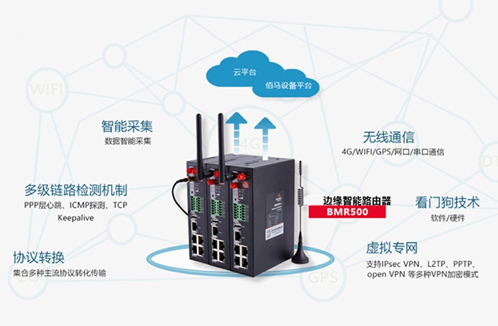 3、边缘智能路由器。实现将有线/4G全网通联网方式、高速路由、WIFI支持、本地存储、设备监测及前端设备控制等功能集合一体,丰富的行业接口和应用功能接口,支持对复杂功能的边缘设备的一站式接入,提高数据通信的集中化水平和高效率。