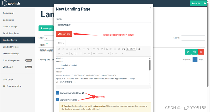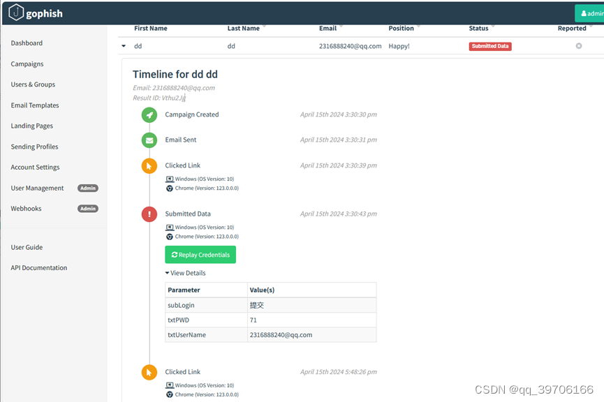 当收件人输入账号密码并且提交后就会通过之前的设置将密码传送Gophish平台
