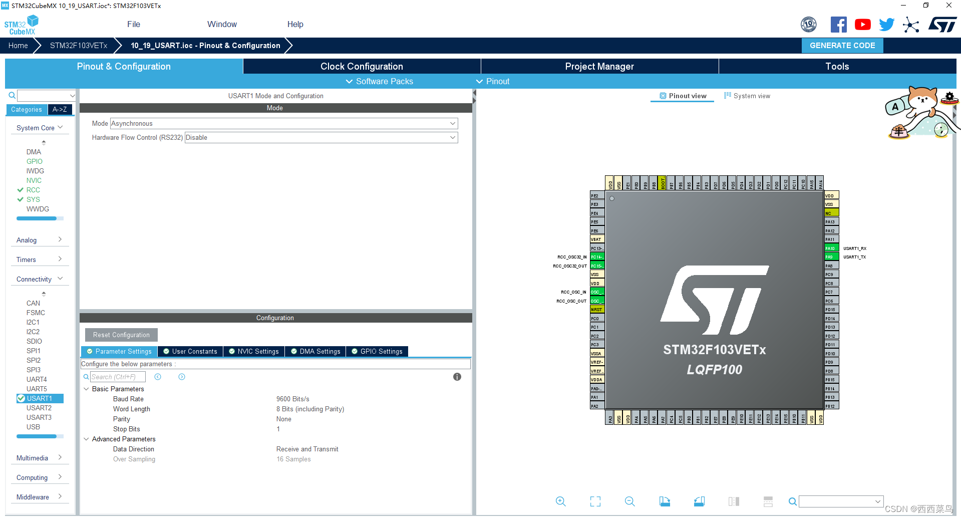 随后我们按照下图配置USART,此处我Mode选择异步、波特率是9600,8位、无校验、停止位1位。