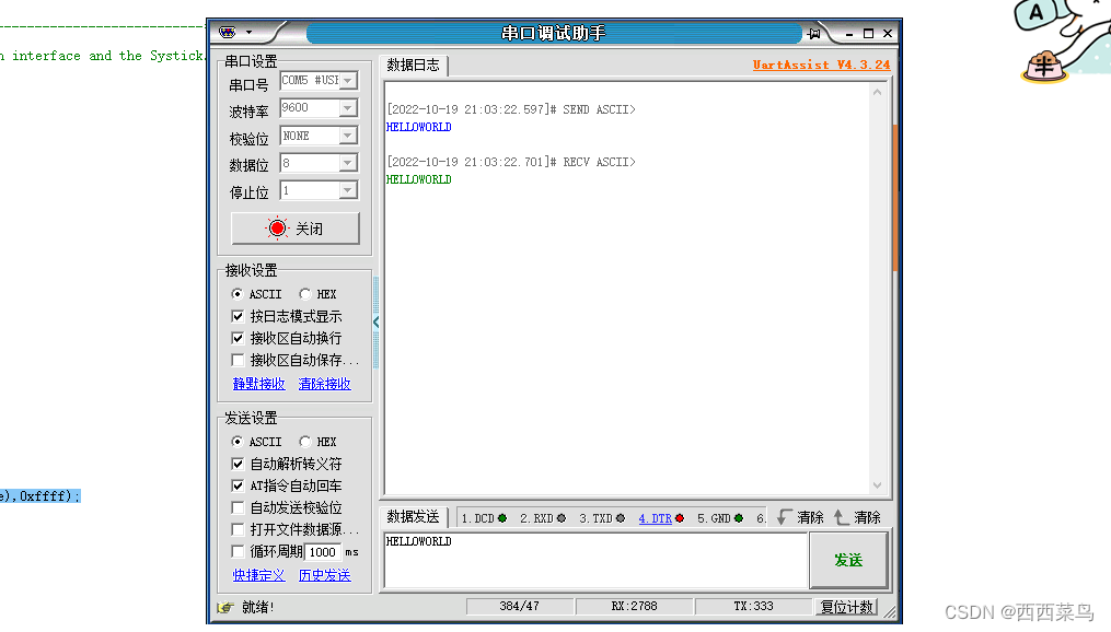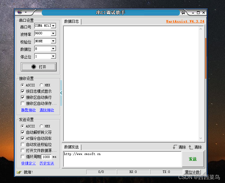 安装完驱动,我们连接好串口,打开串口调试助手,注意波特率等信息需要与程序设置的一致。