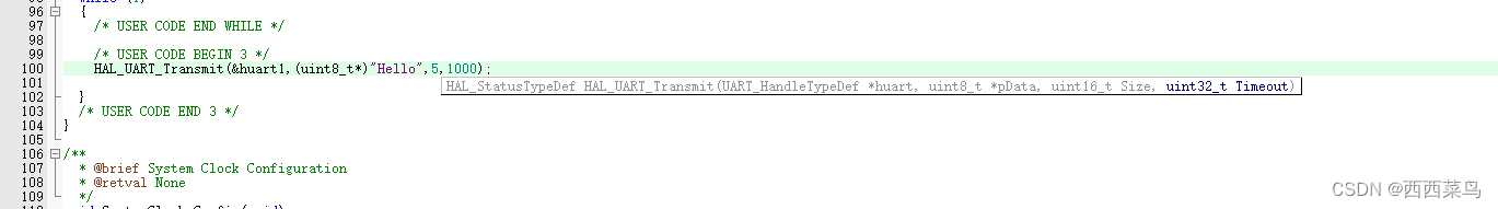 此处我们使用HAL_UART_Transmit函数,参数分别为串口句柄、数据、数据长度、超时时间。