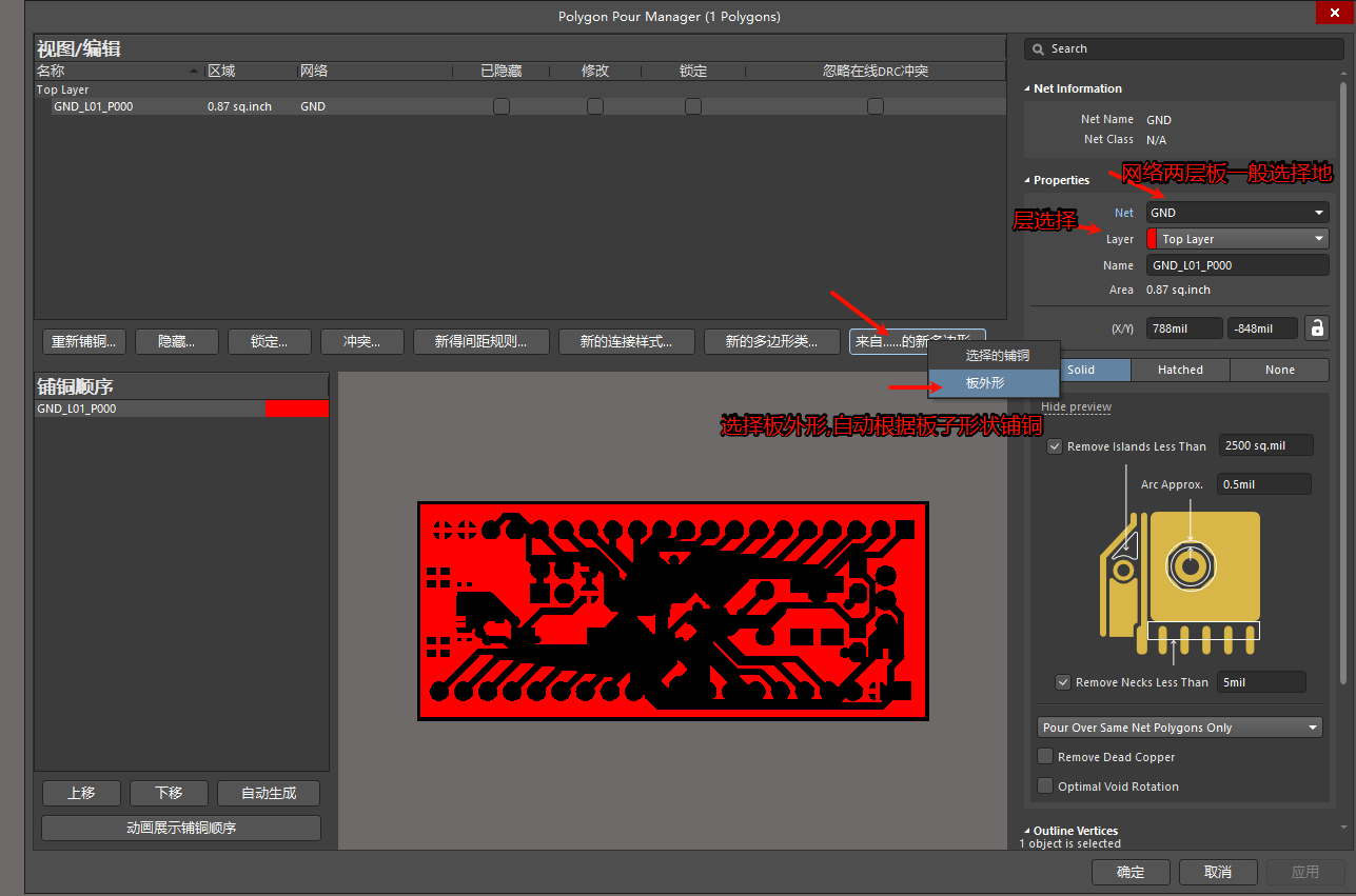 2、选择板外形铺铜,两层板通常对GND进行铺铜,这里需要对顶层和底层都进行相同操作即可