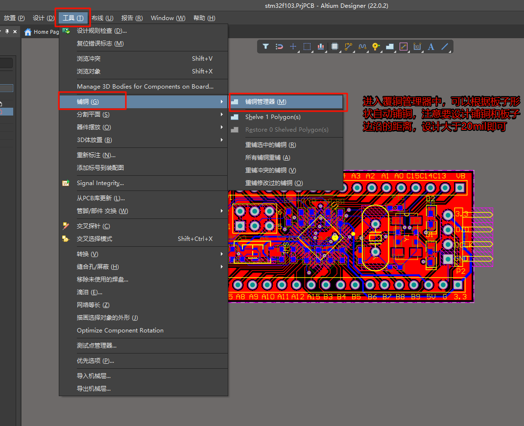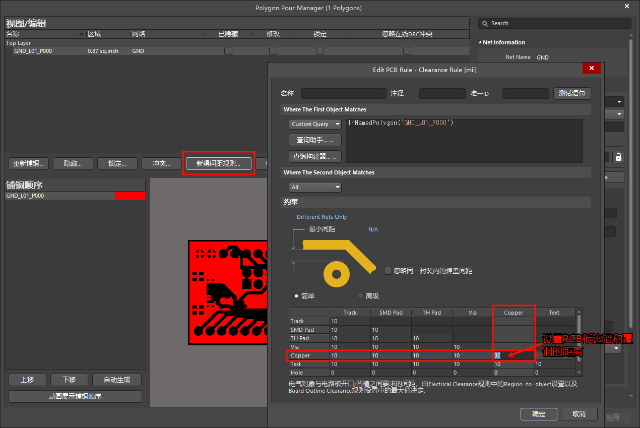 3、设置铺铜和板边沿得距离:这里设计成20mil