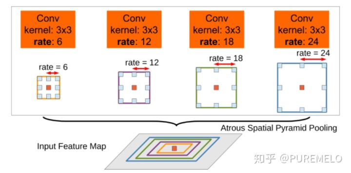 受到SPP的启发,语义分割模型DeepLabv2中提出了ASPP模块,该模块使用具有不同采样率的多个并行空洞卷积层。为每个采样率提取的特征在单独的分支中进一步处理,并融合以生成最终结果。该模块通过不同的空洞rate构建不同感受野的卷积核,用来获取多尺度物体信息,具体结构比较简单如下图所示。
