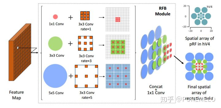 RFB模块是在(ECCV2018:Receptive Field Block Net for Accurate and Fast Object Detection)一文中提出的,该文的出发点是模拟人类视觉的感受野从而加强网络的特征提取能力,在结构上RFB借鉴了Inception的思想,主要是在Inception的基础上加入了空洞卷积,从而有效增大了感受野。