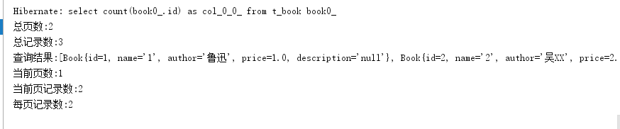@RestController public class BookController { @Autowired BookService bookService; @GetMapping("/findAll") public void findAll() { PageRequest pageable = PageRequest.of(0, 2); Page<Book> page = bookService.getBookByPage(pageable); System.out.println("总页数:"+page.getTotalPages()); System.out.println("总记录数:"+page.getTotalElements()); System.out.println("查询结果:"+page.getContent()); System.out.println("当前页数:"+(page.getNumber()+1)); System.out.println("当前页记录数:"+page.getNumberOfElements()); System.out.println("每页记录数:"+page.getSize()); } @GetMapping("/search") public void search() { List<Book> bs1 = bookService.getBookByIdAndAuthor("鲁迅", 1); List<Book> bs2 = bookService.getBooksByAuthorStartingWith("吴"); List<Book> bs3 = bookService.getBooksByIdAndName("西", 3); List<Book> bs4 = bookService.getBooksByPriceGreaterThan(30F); Book b = bookService.getMaxIdBook(); System.out.println("bs1:"+bs1); System.out.println("bs2:"+bs2); System.out.println("bs3:"+bs3); System.out.println("bs4:"+bs4); System.out.println("b:"+b); } @GetMapping("/save") public void save() { Book book = new Book(); book.setAuthor("鲁迅"); book.setName("呐喊"); book.setPrice(23F); bookService.addBook(book); } }