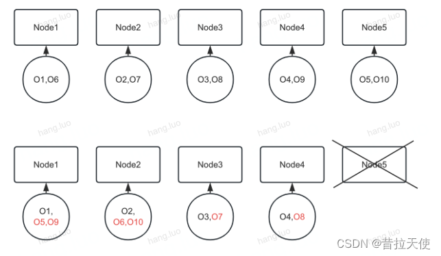 只有node4承担被删除的2个节点的负载。然而,使用HRW,分布仍然是均匀的。