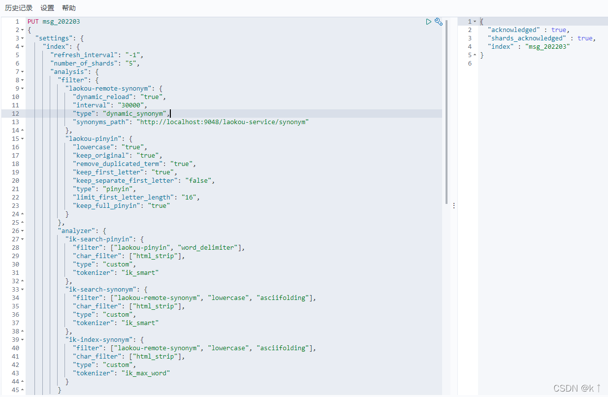 "synonyms_path": "http://localhost:9048/laokou-service/synonym" #远程同义词库地址