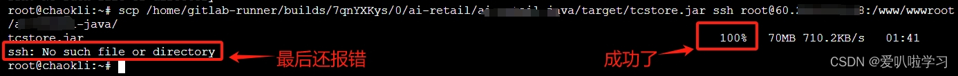 linux 将本机文件传输到远程服务器上,通过scp文件拷贝成功了,远程服务器上已有文件,但是在终端最后还会报错ssh: no such file or directory,为什么?哪位大佬能指教?