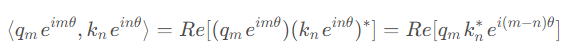 所以,寻求的这个f ( ∗ ) f(*)f(∗)变换,应该具有特性:〈 f ( q , m ) , f ( k , n ) 〉 = g ( q , k , m − n ) \langle f(q, m), f(k, n) \rangle = g(q, k, m-n)〈f(q,m),f(k,n)〉=g(q,k,m−n)